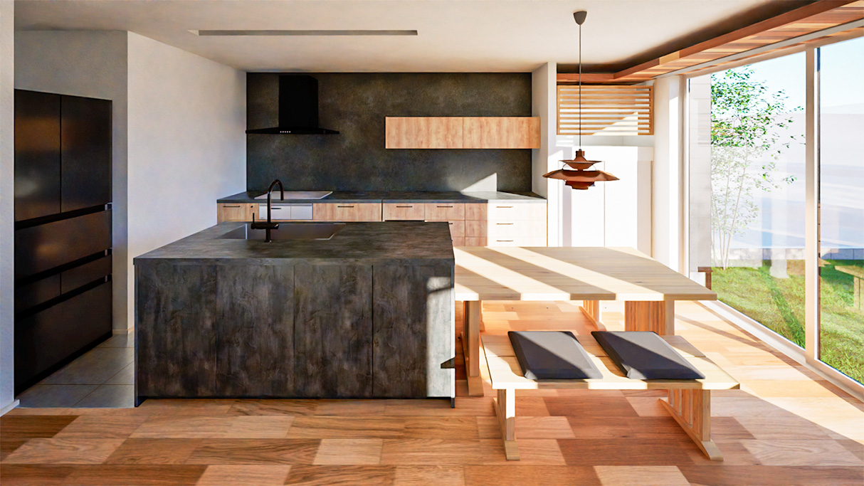 グラフテクトの2型キッチンを中心に据えたLDK。