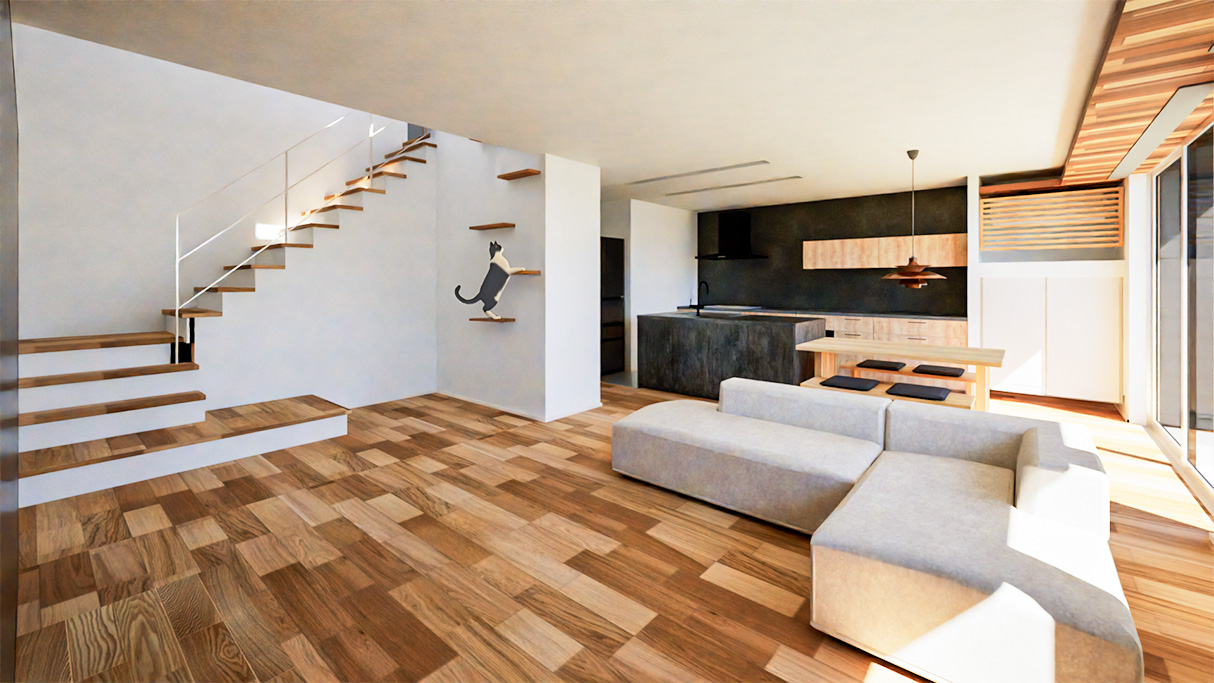 リビングの壁面に設けたキャットウォークは、デザイン性にも配慮し、空間に自然と溶け込む設え。