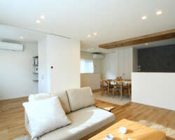 周囲に建物が並ぶ環境の中でも、光を巧みに取り込み、視線をコントロールすることで実現した2階リビング。