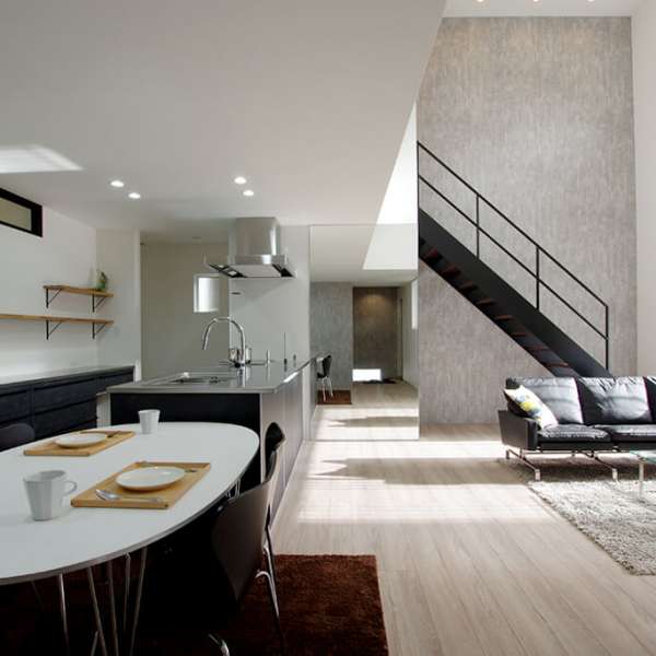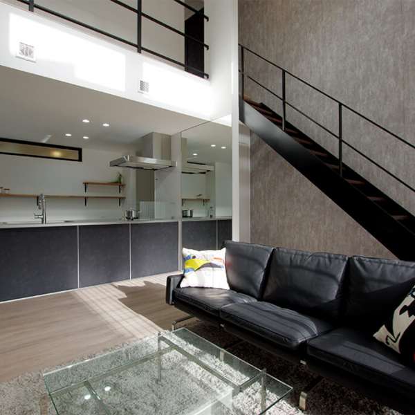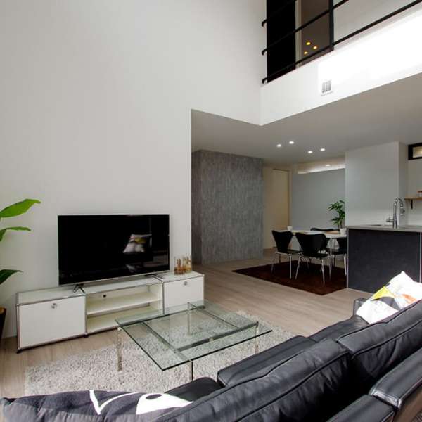 21帖超の広々LDKは鉄骨階段と大きな吹き抜けで採光性と開放感抜群。