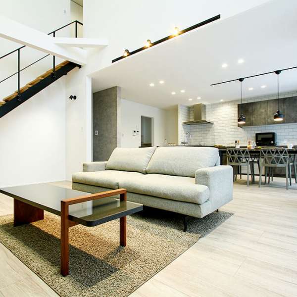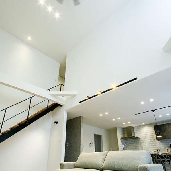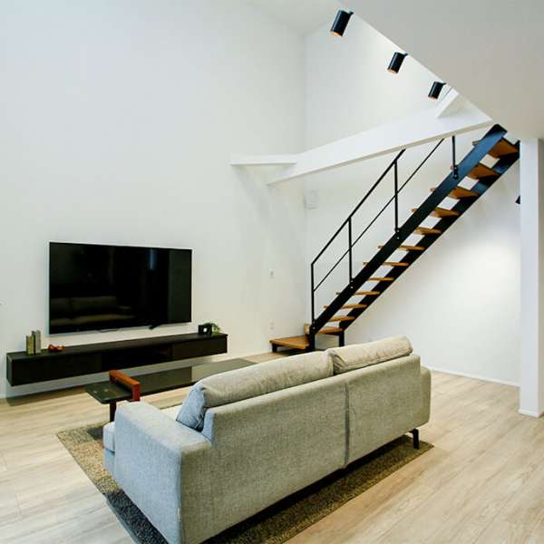 LDKは27帖の広々空間に大きな吹き抜けと鉄骨階段で開放感抜群。